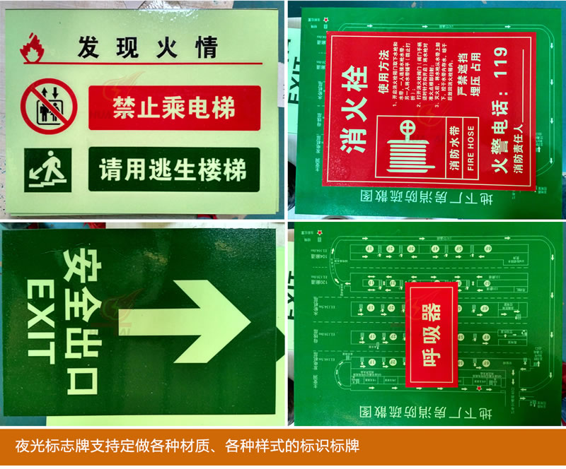 3, PVC夜光標識標牌吸光速度快,發光延續時間長,通常只需5-10分鐘可持續在暗處發光10小時以上,在消防突發事故中 起到信息指示逃生作用